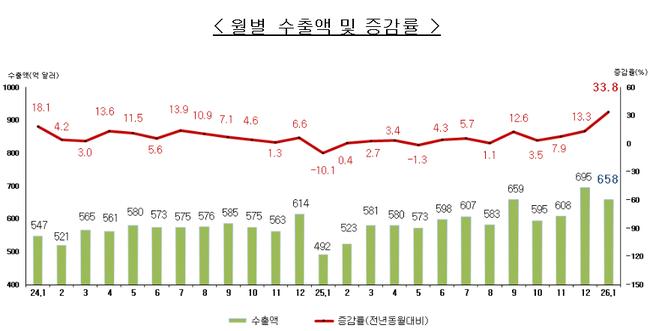 2026년 1월 수출이 658억 달러로 역대 1월 기준 최대치를 기록했다.