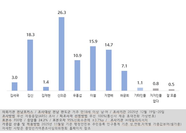 이번 조사는 전라남도 완도군에 거주하는 만 18세 이상 남녀 700명을 대상으로 진행됐다. 김영록 지사 뒤를 이어 신정훈 국회의원 9.8%, 주철현 국회의원 9.4%, 이개호 국회의원 5.6% 순으로 집계됐으며, ‘기타 인물’ 8.3%, ‘지지하는 인물이 없다’ 5.9%, ‘잘 모르겠다’ 7.3%로 나타났다.